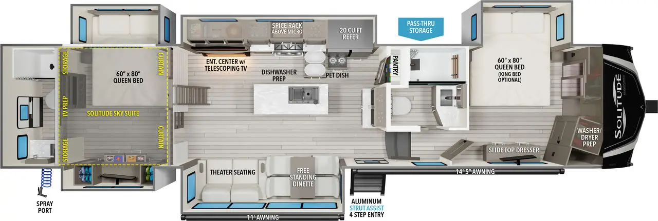 La cuisine a tous les appareils pour vos longs séjours; un réfrigérateur 12V de 8 pieds cubes, un comptoir pressé sans joint, un évier en acier inoxydable encastré avec couvercle et un robinet avec tête mobile, un poêle avec deux brûleurs, un couvercle en verre et un panneau protecteur sous l'armoire du dessus, un four à micro-ondes à convection avec fonction friteuse à air chaud. Sans oublier de petits détails comme une prise électrique rétractable intégrée au comptoir, des lumières DEL d'ambiance, un ventilateur au plafond et un compartiment pour la poubelle.
